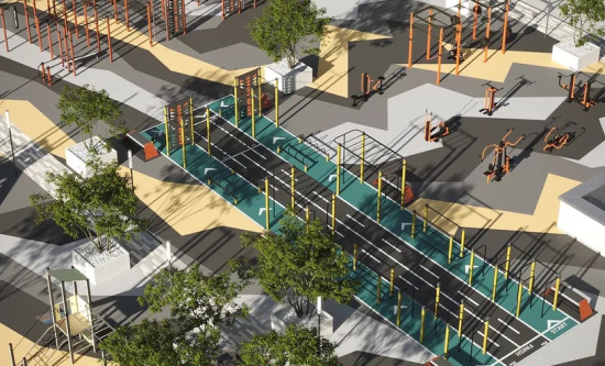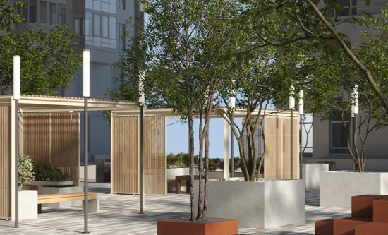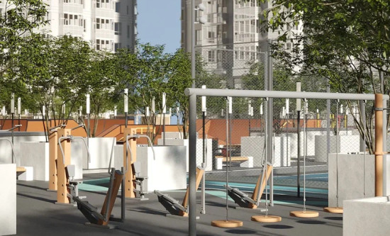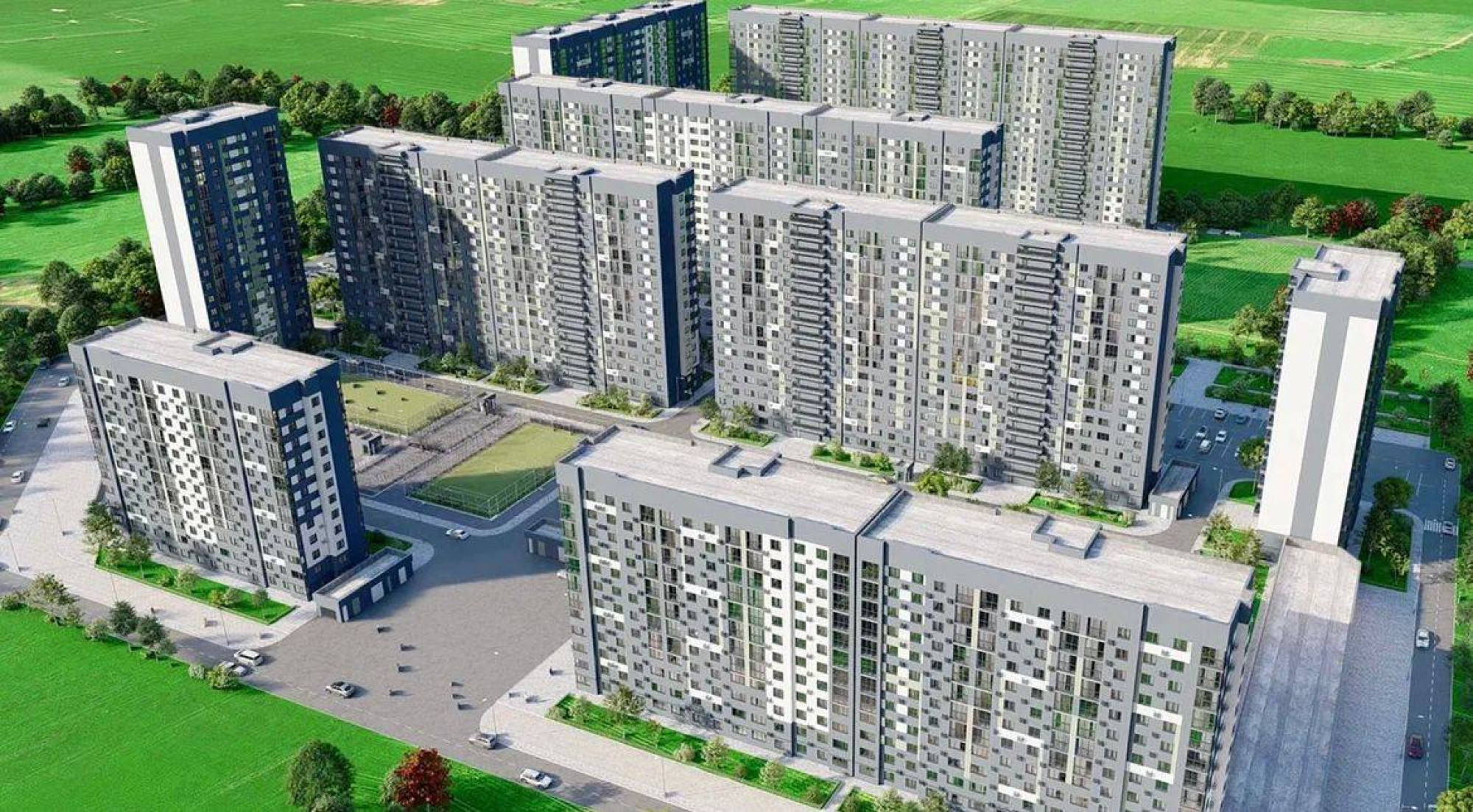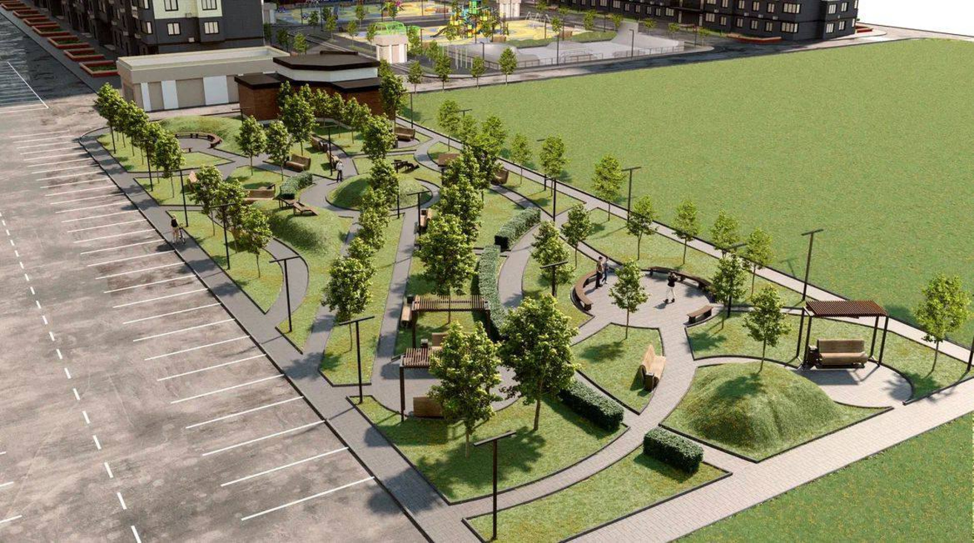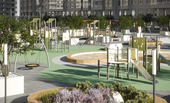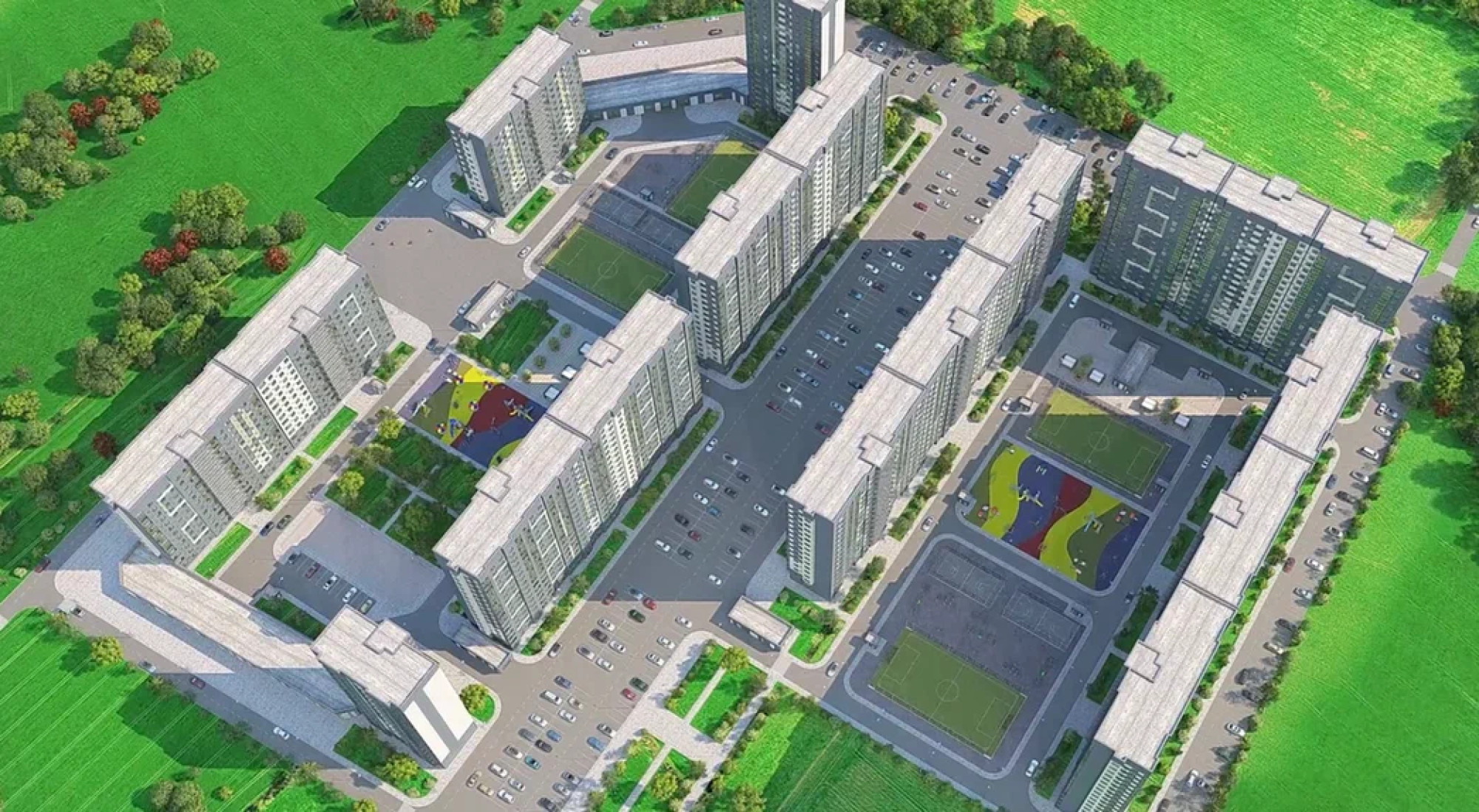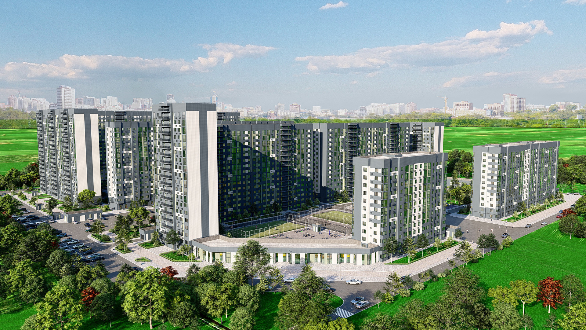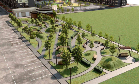 транспортная развязка, магазины, места отдыха и развлечений, парковые зоны.