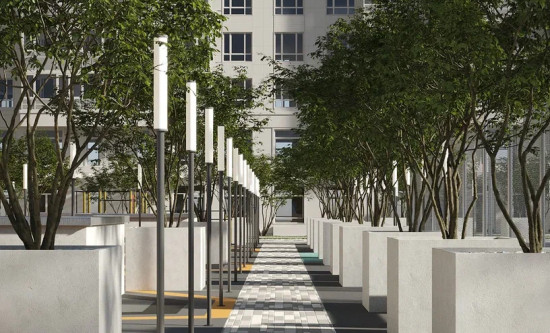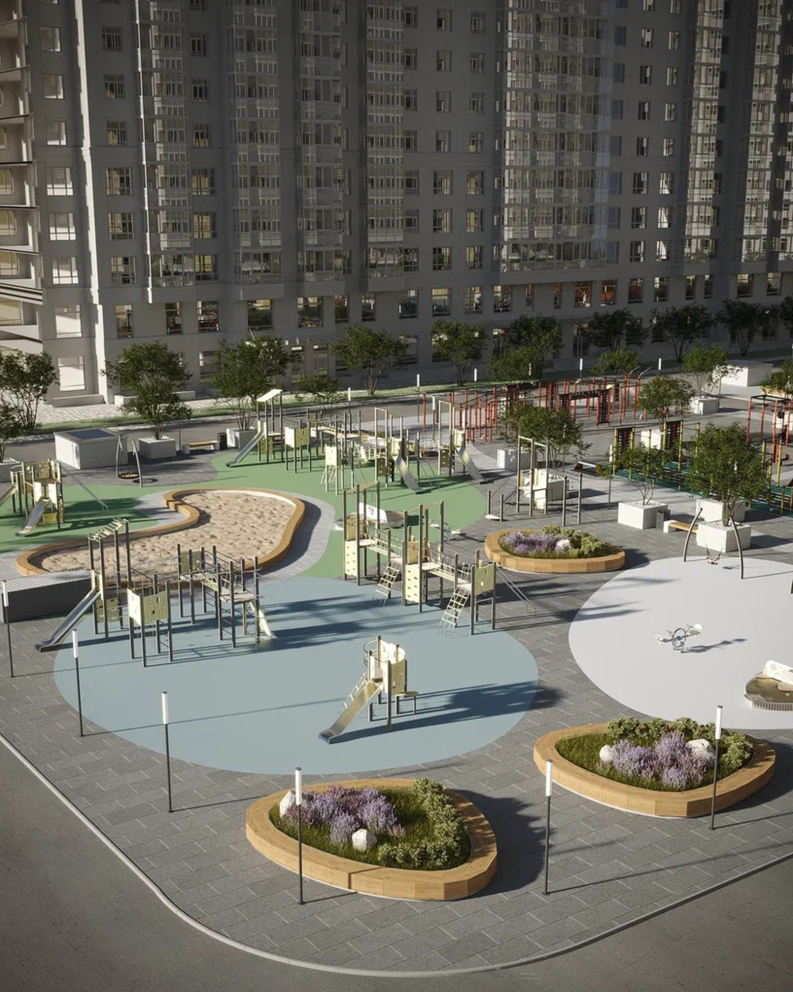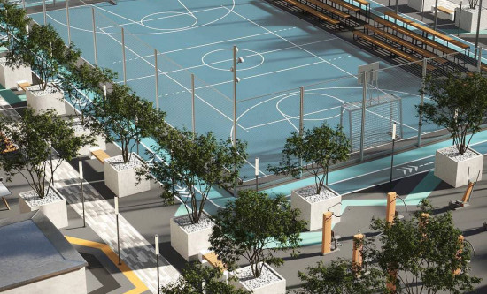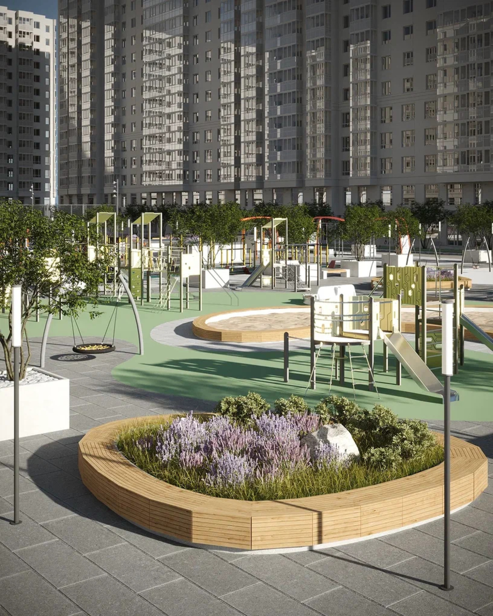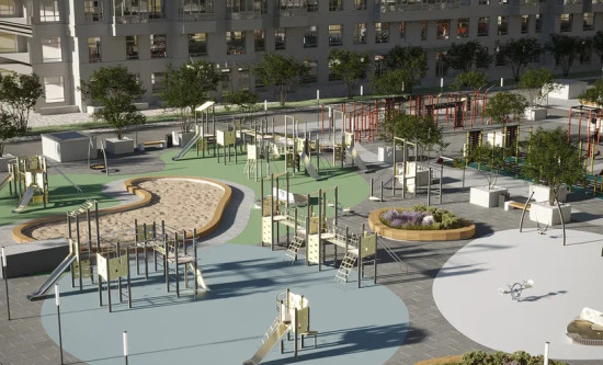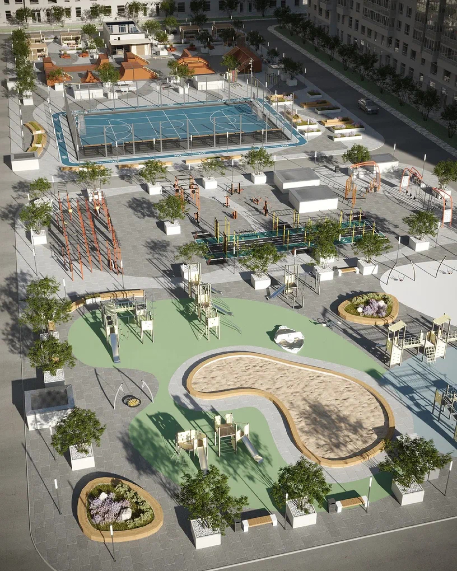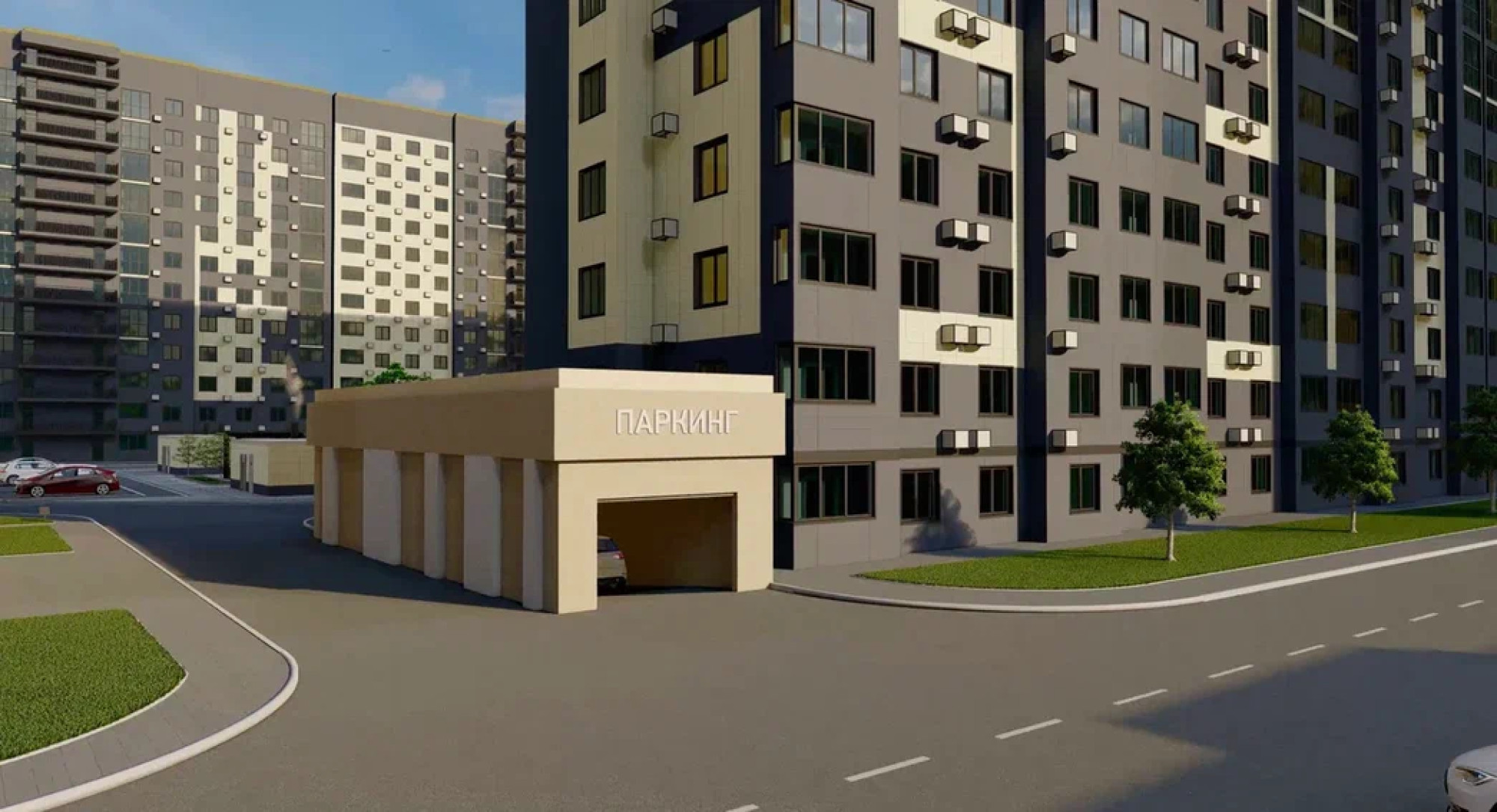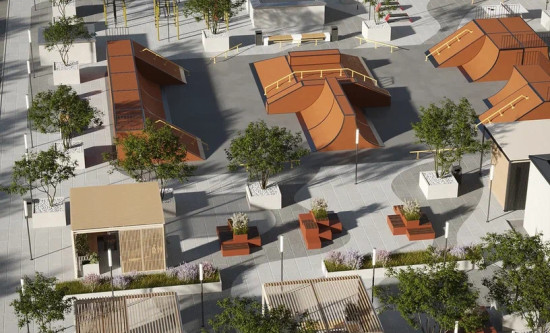 транспортная развязка, магазины, места отдыха и развлечений, парковые зоны.