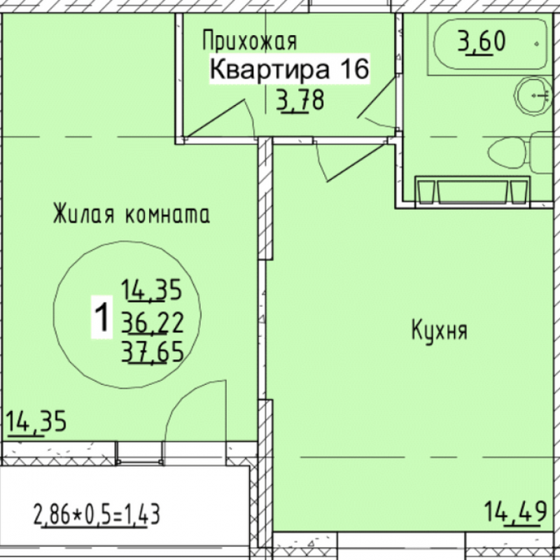 Площадь — 37,65 м²
