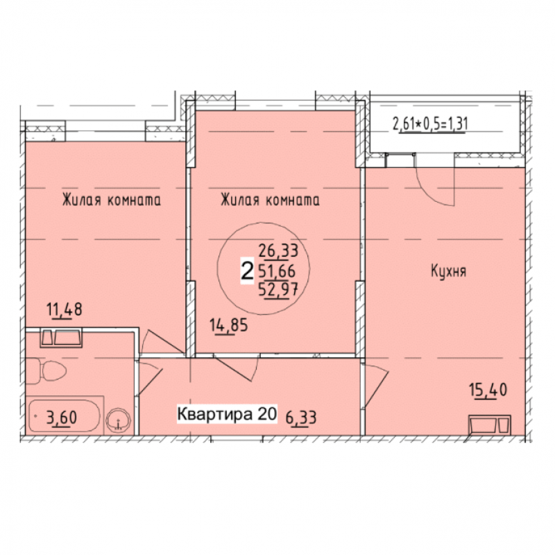Площадь — 52,97 м²